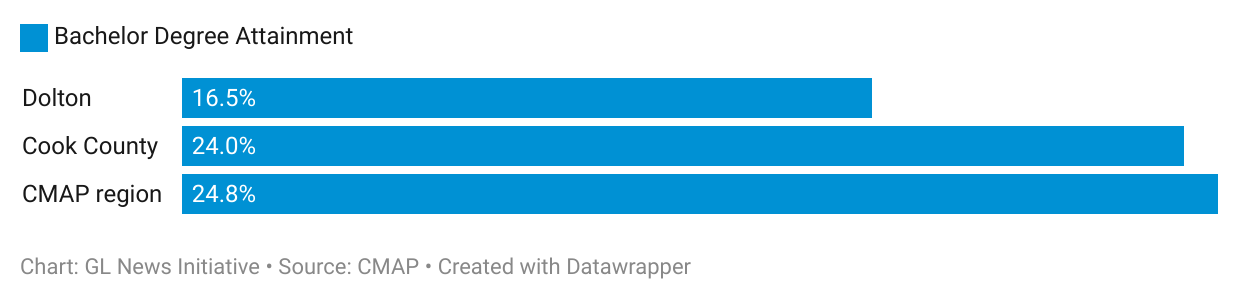 - Only 16.5% of Dolton residents have a bachelor’s degree, compared to 24% in Cook County and 24.8% in the CMAP region. This means fewer people in Dolton have the education needed for higher-paying jobs. Without a degree, it’s harder to find good jobs and move up in a career. Programs like the Illinois Commitment Program could help more people in Dolton go to college and get better jobs.